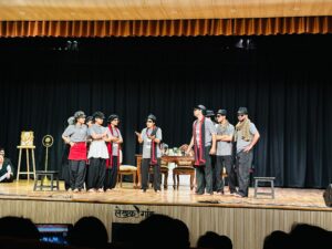 नाटक में तीन कथावाचक—‘का’, ‘हा’ और ‘नी’—रहे, जो पूरे कथानक को रोचक ढंग से आगे बढ़ाते हैं। इसके साथ ही कई कलाकार शरारती अंदाज़ में अलग-अलग किरदारों में मंच पर आते हैं और कहानी में प्रवेश करने की कोशिश करते हुए हास्य और नाटकीयता का वातावरण रचते हैं।